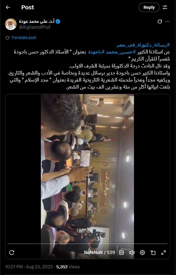 الأخبار : رسالة دكتوراة في مصر عن أ. د . حسن محمد باجودة بعنوان